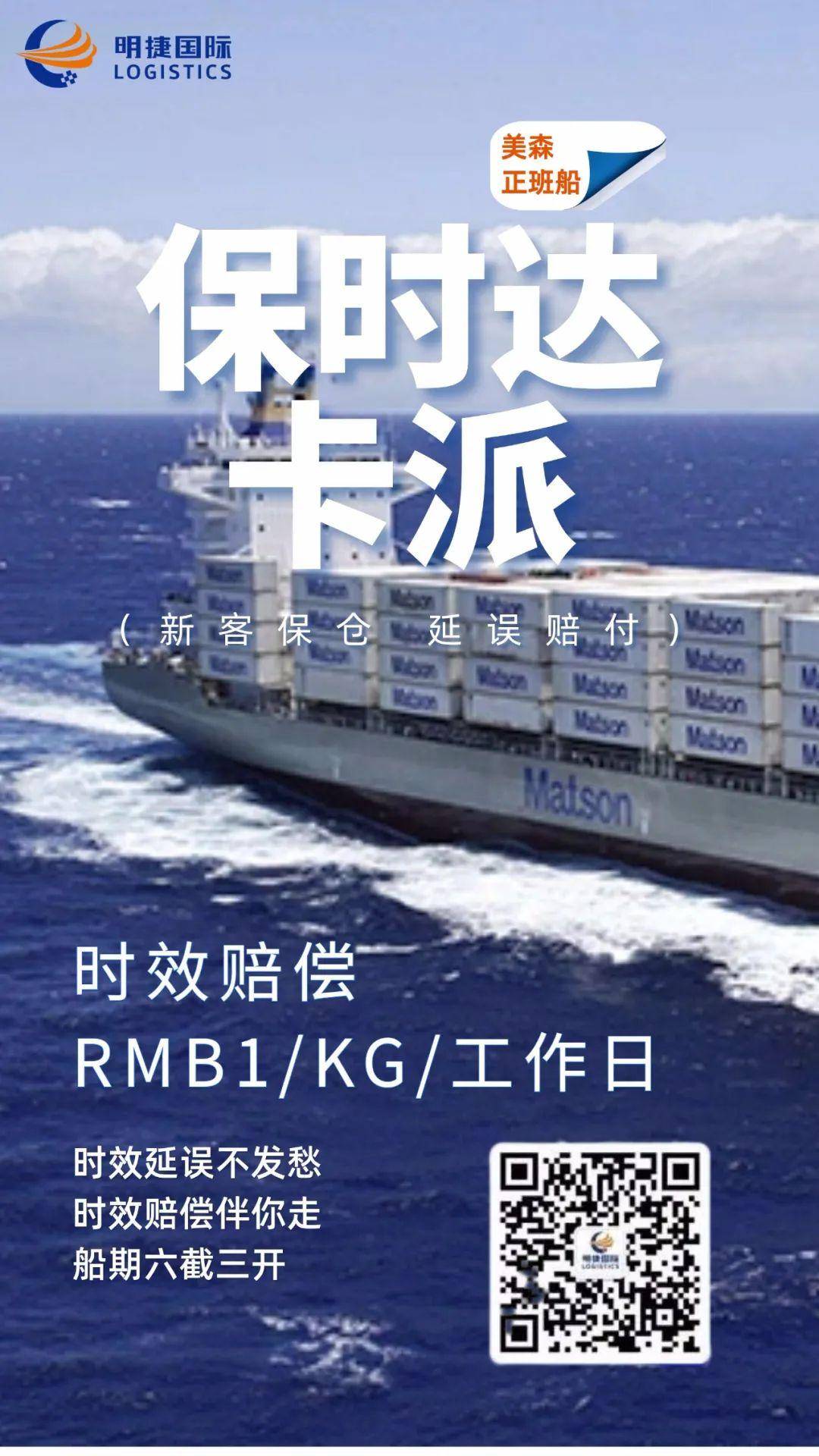 美国主推王牌专线:保时达(美森正班船)、时效快、开船后12个工作日签收,时效有赔偿保障,赔偿1RMB/KG/工作日,即至运费赔完为止。