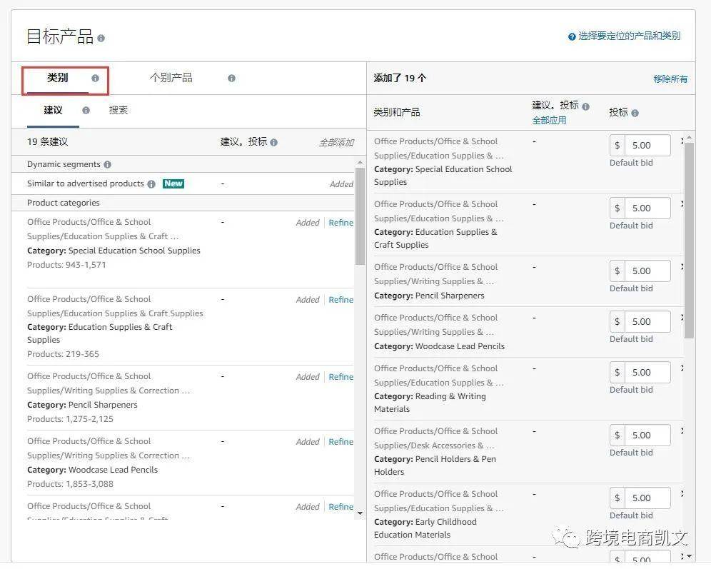 举个例子选择店铺某个ASIN进行商品投放,系统推荐19个类别进行投放,卖家可以全部添加进行投放。