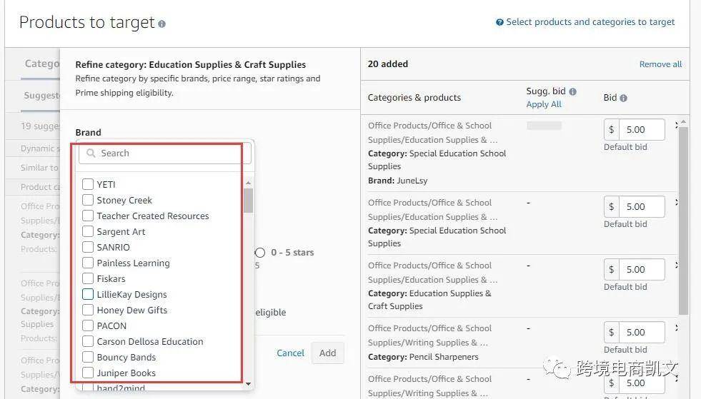 每个类别你可以进行人群标签细分,比如按特定品牌、价格范围、星级和 Prime 运输资格细化类别,比如卖家指定投放到某个竞品品牌,目的抢竞争对手的流量和订单。