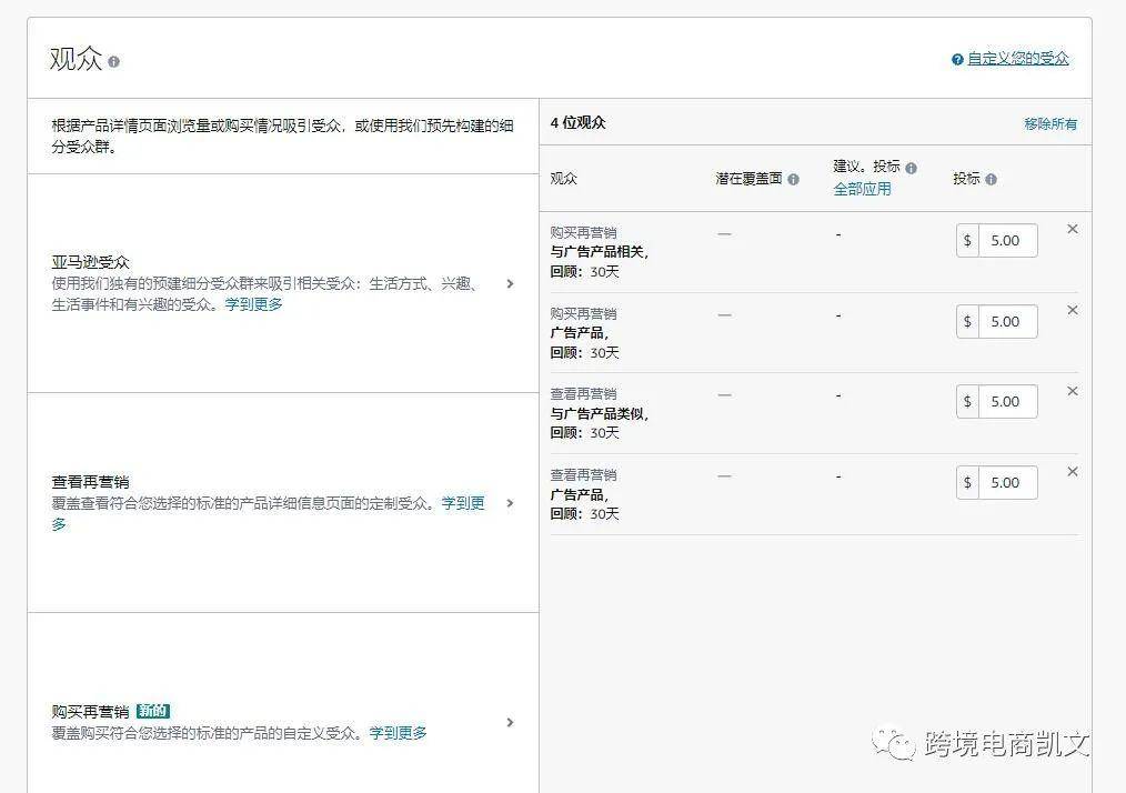 「受众投放」是系统根据产品详情页面浏览量或购买情况吸引受众,或使用我们预先构建的细分受众群,受众里共有三个方向:亚马逊受众、查看再营销、购买再营销。