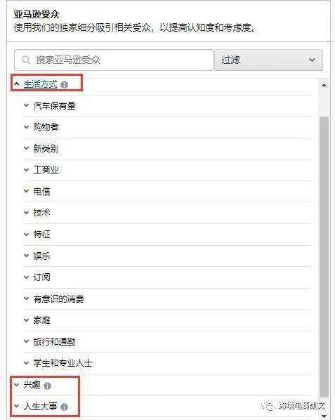 每一个投放分类都可以进行详细划分,比如亚马逊受众细分到人群标签为:生活方式、兴趣、人生大事、有购买意向的,每一个标签都可以再次详细设置,这个对于精细化广告运营的卖家很有必要,减少很多不必要的广告支出。