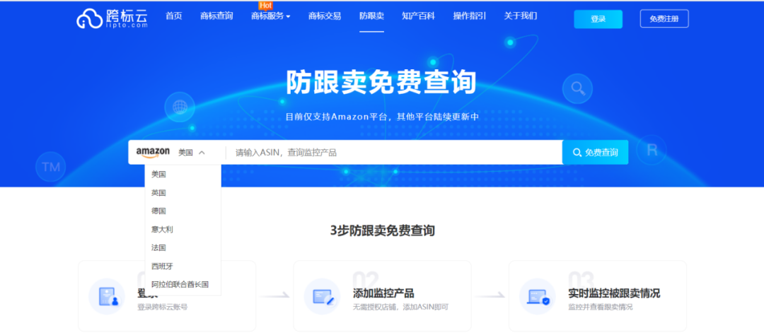 同时,跨标云不断优化提升用户体验,增加更多免费服务。目前,跨标云已对接亚马逊美国、欧盟、英国、中东等多个站点数据库,使用者仅需登录跨标云平台,添加需要监控商品ASIN,即可实时监控并查看跟卖情况。