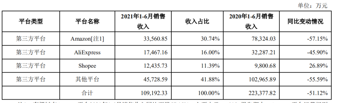 据其数据显示,其主流平台收入都在下降。其中亚马逊平台收入同比下降了57.15%,速卖通收入下降了45.90%,而收入占比11%的虾皮,则增长了26.89%。