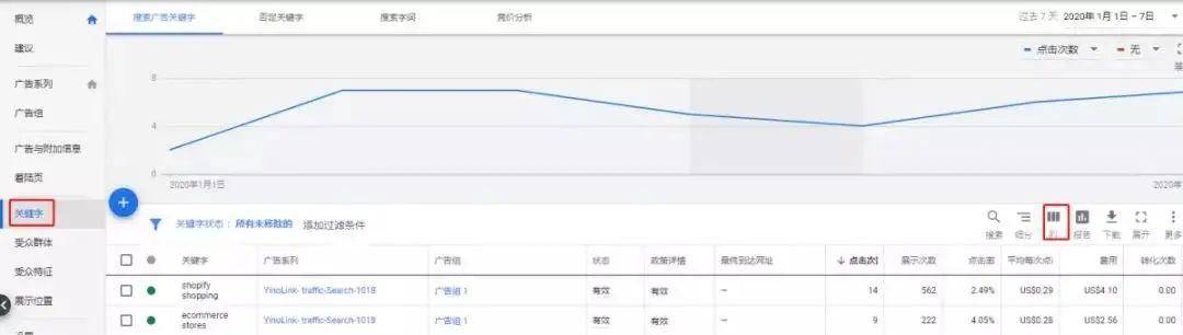 在Google Ads 广告后台,点击Campaigns标签,点击“关键字”,点击“列”
