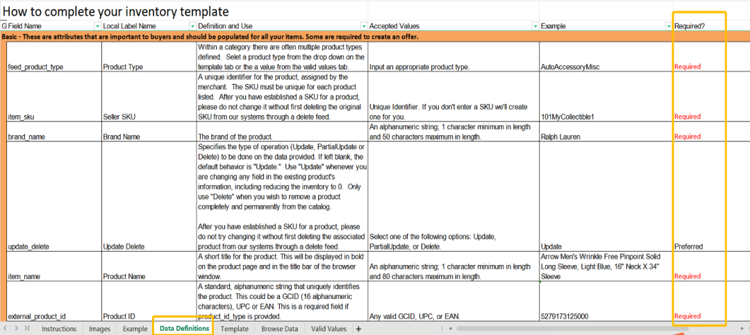 ?下载对应品类产品库存文件模板,在[Data Definitions]表格里标记为Required 属性组全部填写,标记为Preferred和Optional选填项的[基础 Basic], [发现 Discovery], [商品信息完善 Product Enrichment], [尺寸 Dimension] 属性组尽量完善填写