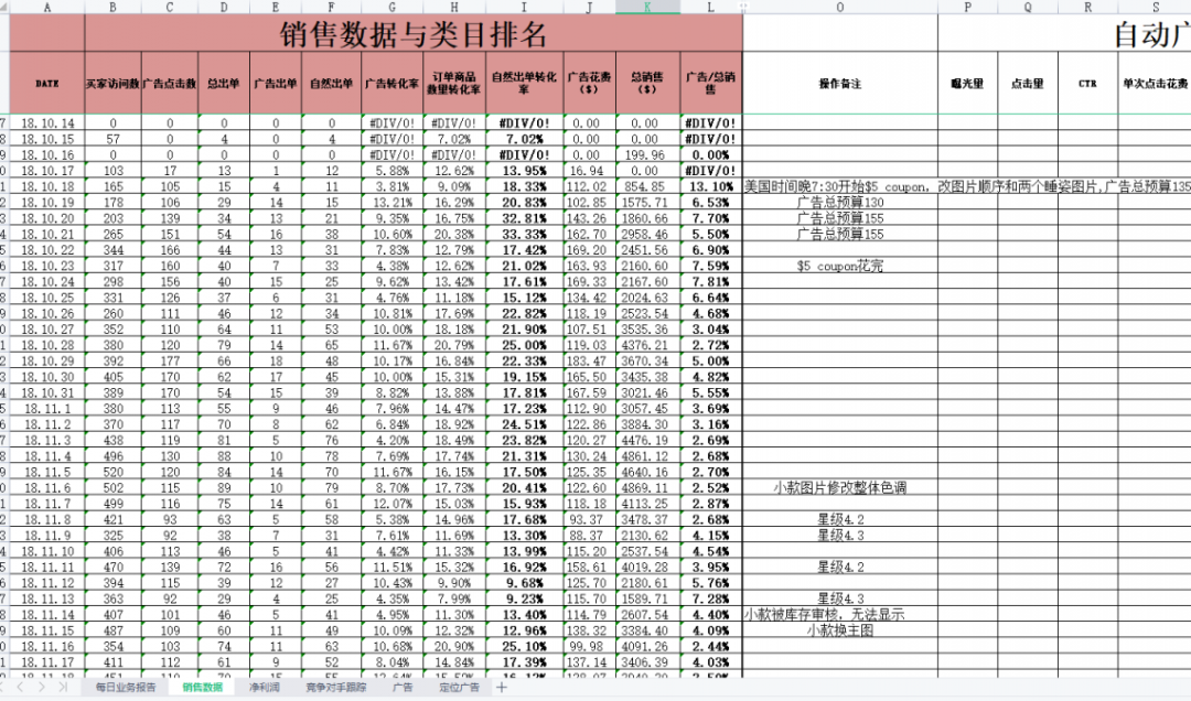 通过这里的数据及备注可以看到,我直接给了这个产品5美金的coupon折扣,然后广告花费从断货前的每天70美金内,直接拉到了最高峰的180美金一天的预算。