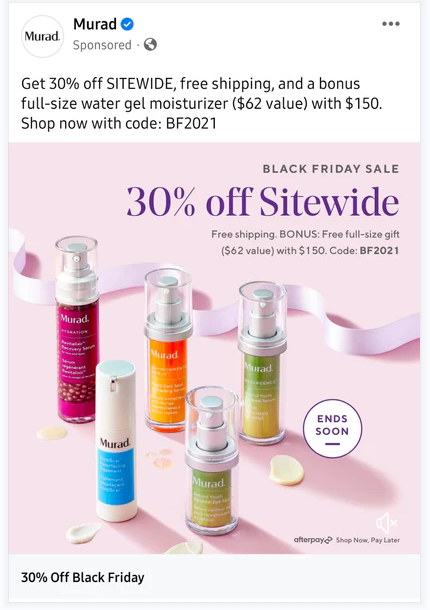 Murad在黑色星期五促销活动中采用了多种促销策略来吸引顾客的注意力和提高购买率。其中,为每次购买提供免费礼物和免费送货是一种非常有效的促销策略,可以激励顾客购买更多的产品,同时提高品牌的客户满意度和忠诚度。