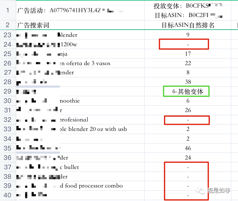 第二个案例的目标竞品BSR排名不高,于是情况就要复杂一些。跑出来的十几个关键词,少部分词近30天在第一页有自然位,多数在前三页有自然位,也有自己不在前3页但同组的变体有自然位的(绿色框),另外一些则是整个Listing都没有自然位的(红色框)。