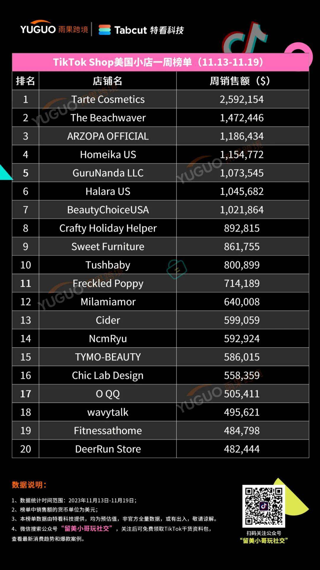 具体前三小店榜单排名为:榜一店铺名 Tarte Cosmetics ,周销售额约 259 万美元,榜二店铺名 The Beachwaver,周销售额约 147 万美元;榜三店铺名 ARZOPA OFFICIAL,周销售额约 119 万美元。