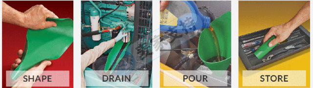Form-a-Funnel® 可以轻松塑造形状,将难以排出的液体直接排入排水管,从而防止油和其他液体接触到用户、车辆和车间地板。使用后要进行清洁,只需喷洒任何清洁剂或除油剂并擦去污垢或油污即可。不使用时,可以平放或卷起存放在工具箱或手套箱中。