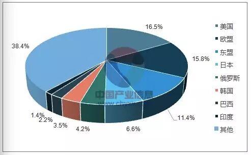 从出口国家来看,美国和欧盟是我国跨境电商主要的出口国家,分别占到 16.5%和 15.8%,其次是东盟(11.4%)和日本(6.6%)。目前多数跨境电商企业的出口目的地是发达国家,成熟市场竞争激烈;而随着俄罗斯、巴西、印度等新兴市场的崛起,仍存在着较大的市场空间。