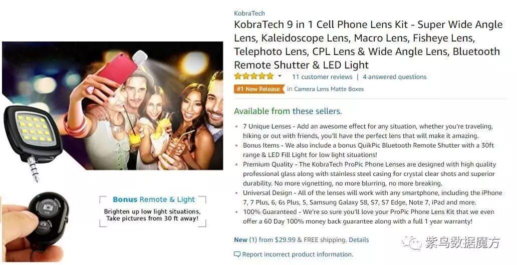 这款商品有7个独特的镜头,超广角镜头,万花筒镜头,远摄镜头...无论你是去旅行,还是和朋友自拍....都会有一个完美的镜头。还包括一个额外的QuikPic蓝牙远程快门,它有30英尺的范围和LED灯,用于低光环境。