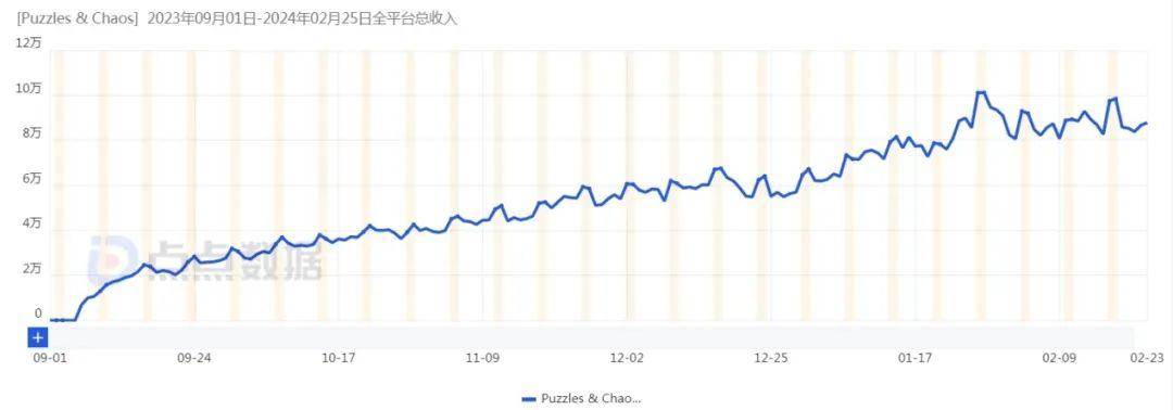 直到最近,三七游戏在 2022 年 12 月上线的另一款“三消+SLG”产品「Puzzles & Chaos: Frozen Castle」(以下简称「Puzzles & Chaos」)才开始逐渐逐渐爬榜。游戏在 2023 年 9 月 5 日之后产生流水,目前已经进入 iOS 美国手游畅销榜 187 位,Google Play 美国手游畅销榜 113 位,最近 30 天总流水已经达到约 242 万美元(约合 1700 万人民币),虽然流水还不算高,但开始展现出一定潜力。