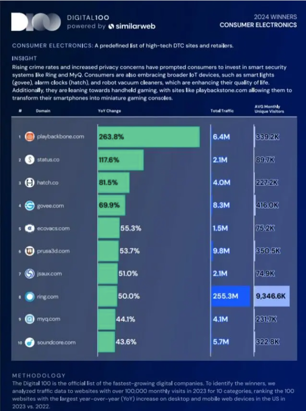 研究方法方面,Digital 100官方榜单涵盖了线上增长速度名列前茅的公司。为了确定这些优胜者,他们分析了5个类别中访客数超过10万的网站,对比了2023年和2022年PC端和移动端网页的美国访客数,列出了年环比增幅最高的100个网站。