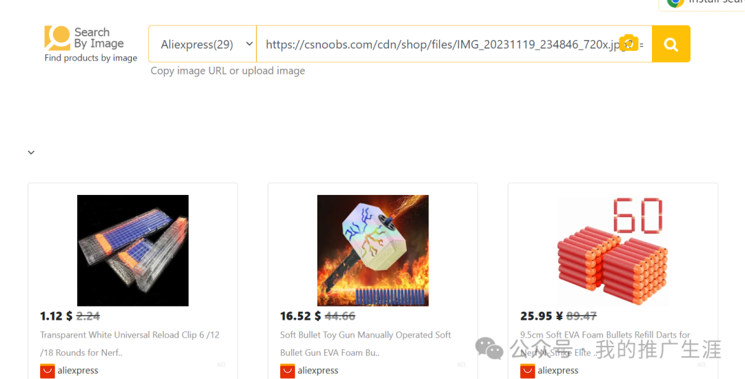 像上面的两个网站产品其实速卖通上面都可以找到的,这里我推荐大家安装一些谷歌浏览器插件,Aliexpress search by image,它可以帮助你找到独立站的产品在速卖通同款,这个就大大节省我们去找产品的时间了,除了Aliexpress,还有1688,淘宝,alibaba搜图插件,大家有需要都可以去搜索安装。