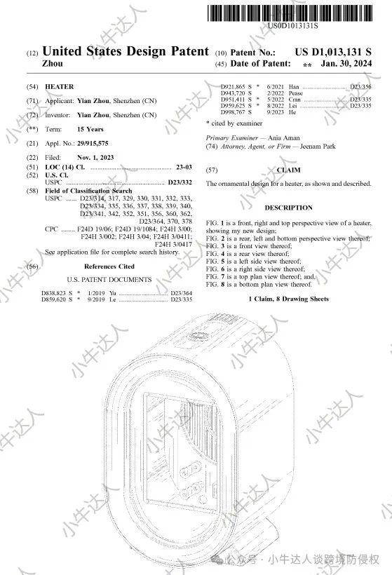 经查询,这款产品于2023年11月1日在美国进行外观专利申请的提交,于2024年1月30日获得了公告。