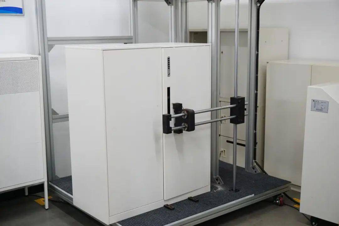 除此之外,工厂还有了完整的质量测试区。例如钢制文件柜的开关测试实验,要保证不能低于10万次。此外,五金配件、喷涂等工序都有对应的测试。