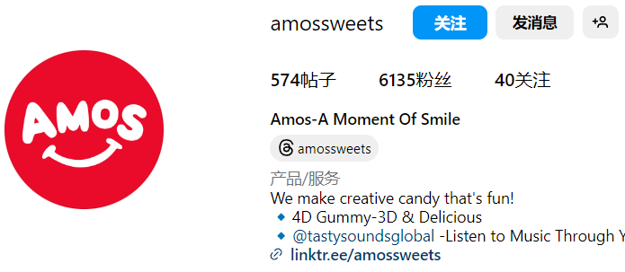 Amos Sweets不仅在Instagram获得6K+的粉丝量,还在TikTok圈粉8K+,获得了15.5K点赞,不仅在账号发布产品视频还会定期进行直播带货,使产品获得更好的曝光。
