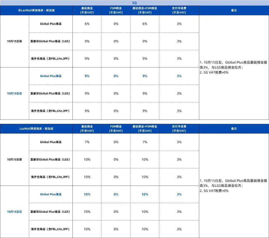 自2024年10月15日起,Lazada SG站跨境商家,Global Plus商品的基础佣金费率将上调3%,使之与LGS商品的佣金费率保持一致。LGS商品和本地履约商品佣金保持不变。本次调整仅为后台费用结构的小幅调整,Global Plus商品现有的物流费用补贴政策不变。