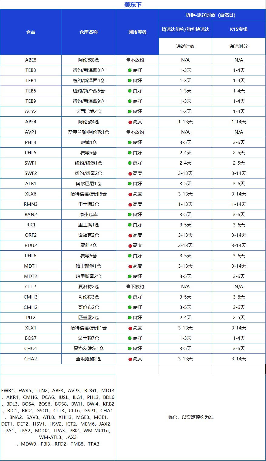以下是当前美线的爆仓情况,以及我司各热门渠道针对各热门仓点的末端作业时效。