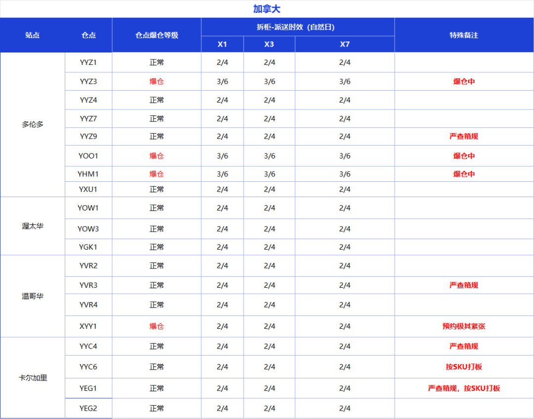 近期,加拿大部分仓库出现爆仓情况,具体如下: